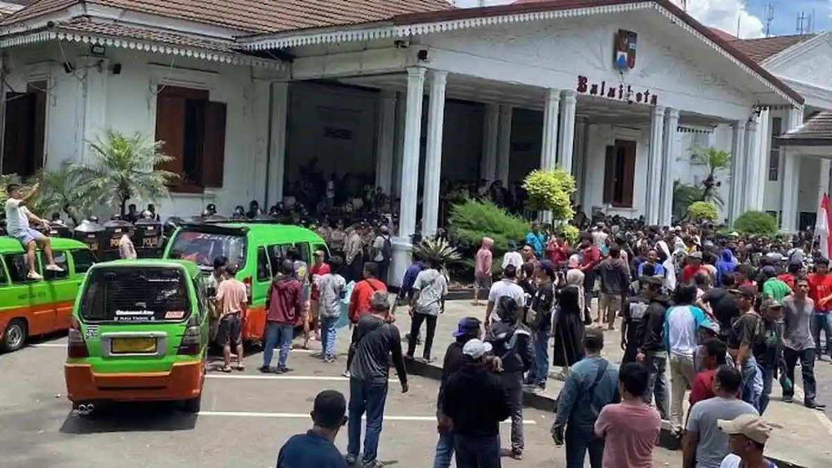 Ratusan sopir angkutan kota (angkot) mendatangi Balai Kota Bogor, Jawa Barat, Kamis (22/1/2026). Mereka menyuarakan penolakan terhadap rencana penghapusan angkot tua yang dinilai mengancam mata pencaharian keluarga.